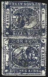 | Keywords: Stamp Buenos Aires 1859 "In Ps" Blue Tete-Beche pair.jpg Alfred H Caspary Lars Amundsen Joseph Schatzkes John R Boker Jr and Gabriel Sanchez Exhibited in Aristocrats of Philately displays at Ameripex in 1986 and Anphilex in 1996 Illustrated in Encyclopedia of Rare and Famous Stamps by L N Williams Sold by Robert A Siegel Auction Galleries Inc Sale - 957 The Islander Collection of South America - June 5-6 2008 Price realised 575 000 http //www siegelauctions com/dynamic/lots php year 2008 lot_name Buenos 20Aires 201859 20 start_lot 82 stop_lot 82 sale_name The 20Islander 20Collection 20of 20South 20America sale_no 957 sale_date Thursday 20June 205 202008 Lot No 82 Robert Siegal Auction 957 June 5-6 2008 author 1859 PD-AR-Anonymous PD-anon-1923 1859 stamps Ships on stamps TĂȘte-bĂȘches Stamps of Buenos Aires Blue stamps Philatelic uploads by Ww2censor Buenos Aires |