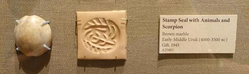 | Keywords: Stamp seal with Animals and Scorpion, Early-Middle Uruk, 4000-5000 BC, brown marble - Oriental Institute Museum, University of Chicago - DSC07200.JPG en Exhibit in the Oriental Institute Museum University of Chicago Chicago Illinois USA This work is old enough so that it is in the public domain Photography was permitted in the museum without restriction 2014-08-22 14 48 24 own Daderot other versions cc-zero Uruk Period stamp seals in the Oriental Institute Museum Uploaded with UploadWizard |