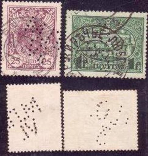 Keywords: Stamps of the Russian Empire perfin cancelled.png en Stamps of the Russian Empire cancelled with perfins 1910s Definitive stamp 25k and 1r stamp from the commemorative issue of 1913 300th anniversary of the Romanov dynasty Moscow Kremlin en Почтовые ма ки Российской импе ии имеющие вто ичное гашение п околом в виде пе финов 1910-е годы номиналом 25 коп станда тная ма ка и 1 уб осковский к емль из юбилейной омановской се ии 1913 года s 1910 http //skandinav eu/page3a3 htm skandinav eu Post Office of the Rissian Empire other versions PD-RusEmpire Definitive stamps of Russia Stamps of Russia 1913 300 years of Romanovs Moscow Kremlin on stamps Postmarks of the Russian Empire Stamps with remainder marks Various stamps in one image Perfins Stamps of Russia to be categorised by subject |