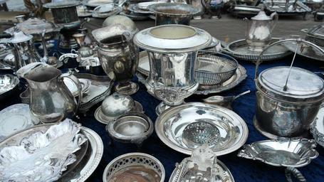 Keywords: stand seller market antiques flea market business silver tableware cup plate vases shells board cover