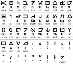 | Keywords: Star-Wars-aurek-besh-alphabet-chart.svg Table of the Aurebesh sometimes Aurek-besh or Aurabesh alphabet one of a number of writing systems used in the galaxy of the Star Wars films The alphabetical order shown is the one in the original graphic captioned The Aurebesh A Star Wars Alphabet S Crane ¢ 8/26/93 Freehand 3 1 http //www echostation com/features/aurebesh htm while most subsequent published sources show the letters corresponding to Latin digraphs ch ae eo kh ng oo sh th grouped together at the end after the 26 letters corresponding to the single Latin letters a - z There is a set of numerals which was subsequently devised for the Aurebesh but the films commonly use ordinary Arabic Hindu numerals so I haven't bothered to include them in this chart All text in image was converted to paths for better display Self-made image based on publicly-available information using the newAurabesh font 2012 AnonMoos Star Wars writing systems Alphabet charts |