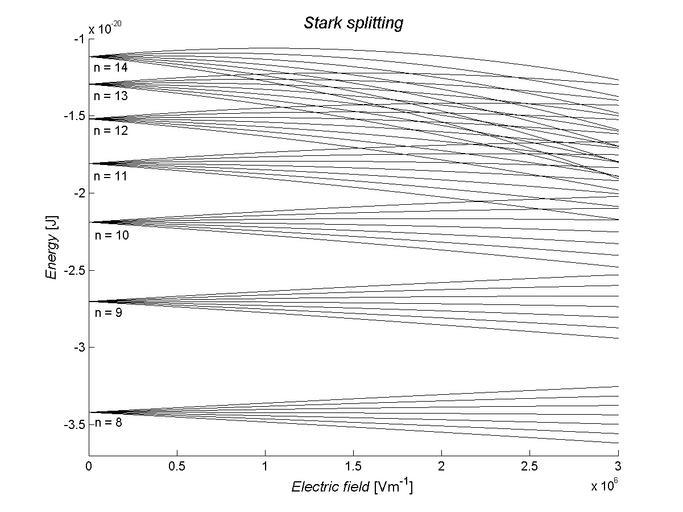 | Keywords: Stark splitting in hydrogen.png This graph shows the energy eigenvalues of Stark shifts in hydrogen as a function of electric field strength Magnetic quantum number m 1 parabolic quantum number n1 ˆ’ n2 -n+2 -n+4 n-4 n-2; states with higher principle quantum number n experience a greater energy shift for a given electric field strength For large field strengths energy eigenvalues do not actually cross; rather the solutions are given by the Mathieu functions DJIndica Source Created using MATLAB 6 5 Date 16/3/2006 Author Jeffrey Philippson Hydrogen physics |