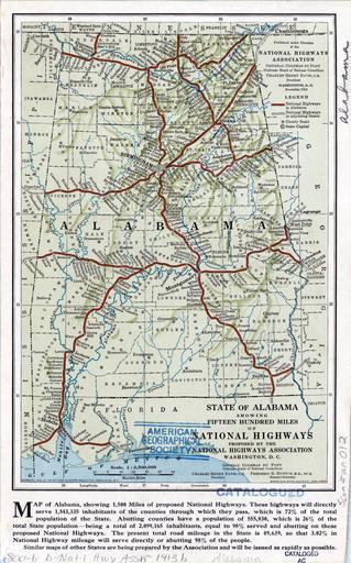 | Keywords: State of Alabama Showing Fifteen Hundred Miles of National Highways WDL11552.png Artwork ru ациональная ассоциация автомагист алей fr National Highways Association en National Highways Association zh 国家公路协会 pt National Highways Association ar الهيئة الوطنية للطرق السريعة es Asociación Nacional de Carreteras ru Ка та штата Алабама с полуто а тысячами миль национальных автомагист алей fr État de l'Alabama avec mille cinq cents miles de routes nationales en State of Alabama Showing Fifteen Hundred Miles of National Highways zh 展示阿拉巴马州 1500 英里国家公路 pt Estado do Alabama mostrando mil e quinhentas milhas de rodovias nacionais ar خمسون ألف ميل من الطرق السريعة المُقترحة لولاية ألاباما ru В 1911 г в США была основана ациональная ассоциация автомагист алей п изванная оказывать содействие азвитию национальной сети качественных автомобильных до ог Под лозунгом Хо ошие до оги всем ациональная ассоциация автомагист алей выступала за ст оительство и постоянное обслуживание феде альным п авительством системы автомагист алей п отяженностью 50 000 миль около 80 500 км а этой ка те выпущенной ассоциацией в 1913 г показана сеть национальных автомагист алей общей п отяженностью 1500 миль 2414 км кото ую п едлагалось создать в штате Алабама ациональная ассоциация автомагист алей п ивлекала к плани ованию ма ш утов будущих до ог инжене ов от кото ых т ебовалось асположить автомагист али в ок угах таким об азом чтобы ими могло пользоваться как можно больше жителей каждого штата В п имечании в нижней части ка ты сообщается что на те ито ии ок угов че ез кото ые п едлагается п оложить автомагист али п оживают 72 п оцента жителей штата и еще 26 п оцентов живут в соп едельных ок угах Помимо выпуска б ошю и екламных п оспектов убеждавших г аждан в необходимости создания национальной системы до ог ассоциация издавала большое количество ка т Ка тог афические аботы выполнялись коллективом п име но из 40 человек в бю о в Саут-Я муте штат ассачусетс п инадлежавшем п езиденту и соуч едителю ассоциации Ча льзу Ген и Дэвису 1865 1951 гг Дэвис полагал что эти ка ты п инесут пользу национальной комиссии по автомагист алям на создание кото ой он надеялся и помогут штатам объединить свои до оги в единую национальную систему Конг есс США так и не п инял план п едложенный ассоциацией однако деятельность этой о ганизации и выпущенные ею ка ты способствовали делу создания национальной до ожной сети <br>Плани ование автомагист алей; До оги fr La NHA Association nationale pour les grandes routes fut établie en 1911 pour promouvoir le développement d'un réseau routier national amélioré aux États-Unis Sous le slogan « De bonnes routes pour tout le monde » la NHA militait pour la construction et l'entretien permanent par le gouvernement fédéral d'un système de grandes routes de près de 80 500 kilomètres 50 000 miles Cette carte qu'elle émit en 1913 montre le tracé des routes nationales s'étendant sur 2 414 kilomètres 1 500 miles proposé pour l'Alabama Les ingénieurs employés par la NHA devaient planifier les routes en s'assurant que la proportion de la population située dans les comtés traversés par ces grandes routes était optimale et ce pour chaque État La note au bas de la carte indique que 72 pour cent des habitants de l'État vivaient dans les comtés traversés par les grandes routes proposées tandis que 26 pour cent vivaient dans les comtés voisins Outre la diffusion de brochures et de prospectus visant à convaincre les citoyens du besoin d'un réseau routier national la NHA produisit un grand nombre de cartes Le travail de cartographie était effectué dans un bureau de South Yarmouth dans le Massachusetts où près de 40 personnes étaient employées sur la propriété de Charles Henry Davis 1865 1951 président et cofondateur de la NHA Davis pensait non seulement que ces cartes seraient utiles à la commission des grandes routes nationales dont il espérait la création mais qu'elles aideraient également les États à intégrer leurs routes dans un système national Bien que le Congrès n'adoptât jamais le plan proposé par la NHA cette organisation et ses cartes servirent la cause d'un réseau routier national <br>Planification des routes; Routes en The National Highways Association NHA was established in 1911 to promote the development of an improved national road network in the United States Under 