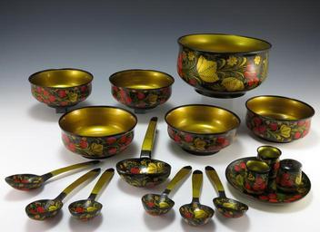 | Keywords: State Gifts Lacquer Bowls.JPG en 18 piece wooden lacquered bowl set painted with red and gold floral designs against a black background The set contains one large bowl six small bowls one large spoon six small spoons a small tray with two jigger size containers and one salt shaker Gift of Boris P Bugayev Minister of Civil Aviation of the Union of Soviet Socialist Republics USSR lacquer various Institution Gerald R Ford Presidential Museum http //www fordlibrarymuseum gov/museum/ArtifactCollectionSamples/Catagories/StateGifts/LaquerBowls html Lacquer bowls USSR accession number 1987 116 1a-r credit line Courtesy of the Gerald R Ford Presidential Museum Donation Date November 29 1974 Institution Institution Gerald R Ford Presidential Museum Gerald R Ford Presidential Library and Museum-cooperation PD-USGov Uploaded with UploadWizard Gifts of heads of state in the Gerald R Ford Presidential Museum Wooden bowls Lacquerware Relations of the Soviet Union and the United States Wooden spoons Wooden tableware |