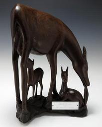 | Keywords: State Gifts Wood Carving.JPG en Wooden carving of a mother gazelle eating with two fawns One fawn is feeding from the mother A metal plate on the lower part of the front of the carving bears presentation information Gift of General Babia Zongbi Malobia Director General of the National Defense Zaire wood 21 H x 15 W x 7 5 D Institution Gerald R Ford Presidential Museum http //www fordlibrarymuseum gov/museum/ArtifactCollectionSamples/Catagories/StateGifts/DeerSculpture html Wooden sculpture Zaire accession number 1989 967 credit line Courtesy of the Gerald R Ford Presidential Museum Donation Date June 17 1976 Institution Institution Gerald R Ford Presidential Museum Gerald R Ford Presidential Library and Museum-cooperation PD-USGov Uploaded with UploadWizard Gifts of heads of state in the Gerald R Ford Presidential Museum Carving Gazelles in art International relations of the Democratic Republic of the Congo International relations of the United States |