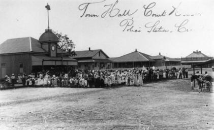 | Keywords: StateLibQld 1 101412.jpg en Celebrations in the street in front of the Town Hall Croydon ca 1901 Croydon is located in the heart of the Gulf Savannah in north west Queensland When first settled in the 1880s Croydon was a large pastoral holding until gold was discovered in 1885 By 1887 the town's population had reached around 7 000 and during its heyday Croydon was the fourth largest town in the colony of Queensland A large crowd is gathered in the main street possibly to celebrate Federation Buildings include the Town Hall Court House and Police Station The Queensland Mining building is at the bottom of the street ~ 1901 handle 10462/deriv/68669 Item is held by John Oxley Library State Library of Queensland PD-Australia StateLibQld-License Streets in Croydon Queensland Town halls in Queensland Queensland Heritage Register |