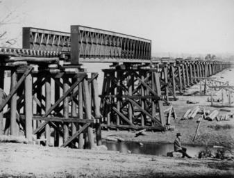 | Keywords: StateLibQld 1 103526 Condamine River Railway Bridge, Warwick district, 1882.jpg en Condamine River Railway Bridge Warwick district 1882 Wooden trestle railway bridge crossing the river plains outside Warwick This is the longest bridge on the southern line Its total length when built was 1979 feet 6 inches and includes one 100 ft iron girder span over the river and eighty-seven 20 ft spans the twenty-sixes having double and the twenties single wooden girders It was officially opened on 5th May 1880 1882 handle 10462/deriv/90748 Item is held by John Oxley Library State Library of Queensland PD-Australia StateLibQld-License Railway bridges in Queensland Wooden bridges in Australia Condamine River Warwick Queensland 1882 in Queensland Black and white photographs Southern railway line Queensland |