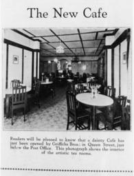 | Keywords: StateLibQld 1 109588 Interior of the artistic new tea rooms, opened by Griffiths Bros., in Brisbane in 1922.jpg supplied with photograph 1922 handle 10462/deriv/129061 Copied and digitised from an image appearing in Queensland Society Magazine August 1922 p 26 PD-Australia StateLibQld-License Restaurants in Australia Dining rooms in Queensland Tables in Australia Chairs in Australia Buildings in Brisbane 1922 in Brisbane Black and white photographs 1922 photographs | ||||