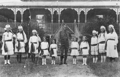 | Keywords: StateLibQld 1 111132 Portrait of the Charters Towers Junior Red Cross Group, ca. 1917.jpg en Portrait of the Charters Towers Junior Red Cross Group ca 1917 <br /> Portrait of the Charters Towers Junior Red Cross Group posing on the grass in front of a house A man in military uniform poses in the centre of the group and has a cane The girls wear headgear inscribed with their battalion dresses sashes around the waist shoes and socks The verandah balustrade and awning is prominent behind the group circa 1917 handle 10462/deriv/131567 Item is held by John Oxley Library State Library of Queensland PD-Australia StateLibQld-License Children of Queensland Groups of people in Australia 1910s in Australian society People of Charters Towers 1917 in Queensland Red Cross in Australia Black and white photographs Red Cross uniforms |