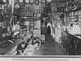 | Keywords: StateLibQld 1 112816 Interior of Dalton Brothers Grocery Shop in Ipswich, ca. 1910.jpg en Interior of Dalton Brothers Grocery Shop in Ipswich ca 1910 Grocers and provision merchants situated on Nicholas Street in Ipswich Well-stocked ship with seating available for shoppers while their orders are being made up Household goods such as teapots and cooking utensils as well as comsumeables circa 1910 handle 10462/deriv/133580 Item is held by John Oxley Library State Library of Queensland PD-Australia StateLibQld-License Grocery stores in Australia Merchants from Australia Building interiors in Queensland Women's clothing of Australia Buildings in Ipswich Queensland 1910 in Australia Black and white photographs |