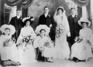 | Keywords: StateLibQld 1 113908 Benjamin Foote's wedding to Miss Susan Evelyn McLeod.jpg en Benjamin Foote's wedding to Miss Susan Evelyn McLeod Wedding party at the Foote-McLeod wedding abounds with flowers Two flowergirls two bridesmaids a groomsman and best man are photographed with the bride and groom 1903-09-16 handle 10462/deriv/135882 Item is held by John Oxley Library State Library of Queensland PD-Australia StateLibQld-License Bridesmaids of Australia Headgear of Australia People with hats Flower bouquets in Australia Wedding parties Men's clothing of Australia Wedding dresses in Australia 1903 in Australia Black and white photographs |