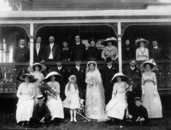 | Keywords: StateLibQld 1 116840 Fashionable wedding group, ca. 1911.jpg en Fashionable wedding group ca 1911 Bridesmaids and women guests wore elaborate hats to this wedding ca 1911 Bridesmaids carry long handled bouquets The Minister stands with older family members on the verandah circa 1911 handle 10462/deriv/139987 Item is held by John Oxley Library State Library of Queensland PD-Australia StateLibQld-License Brides of Australia Headgear of Australia People wearing hats Flower girls Flower bouquets in Australia Women's clothing of Australia Black and white photographs |