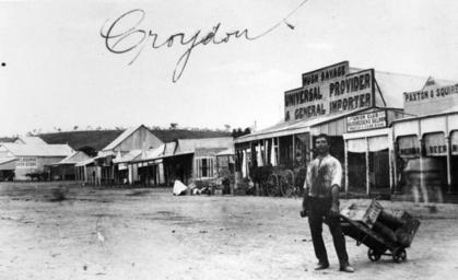 | Keywords: StateLibQld 1 118180 View of Sircom Street, Croydon, ca. 1907.jpg en View of Sircom Street Croydon ca 1907 Croydon is located in the heart of the Gulf Savannah in north west Queensland When first settled in the 1880s Croydon was a large pastoral holding until gold was discovered in 1885 By 1887 the town's population had reached around 7 000 and during its heyday Croydon was the fourth largest town in the colony of Queensland Street scene shows a variety of business houses lining one side of the street and a young man with a barrow loaded with goods Hugh Savage's general store has goods for sale which are spilling out onto the street circa 1907 handle 10462/deriv/107667 Item is held by John Oxley Library State Library of Queensland PD-Australia StateLibQld-License Roads in Far North Queensland Streets in Croydon Queensland 1907 in Australia Black and white photographs |