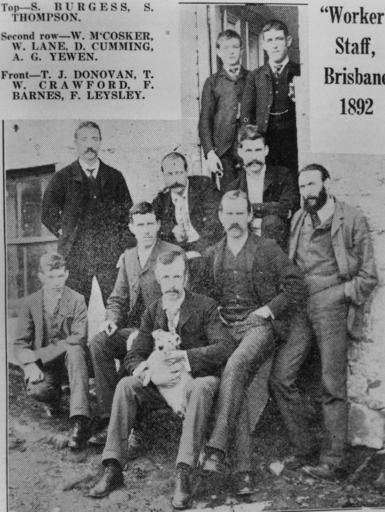 | Keywords: StateLibQld 1 118840 Worker staff, Brisbane, 1892.jpg supplied with photograph 1892 handle 10462/deriv/107703 Copied and digitised from an image appearing in The Worker Golden Jubilee 1890-1940 p 59 Contributor s Worker Brisbane Qld PD-Australia StateLibQld-License Dogs of Australia Men's clothing of Australia Newspaper buildings in Australia 1892 in Queensland Black and white photographs | ||||