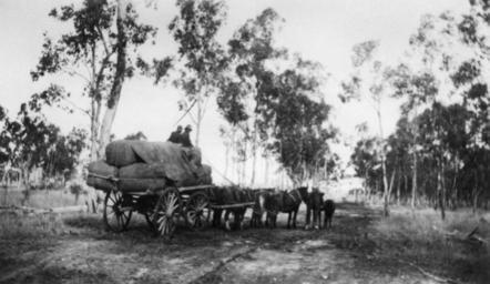 | Keywords: StateLibQld 1 119272 Load of cotton bales from J. W. Well's Cania property, May 1925.jpg en Load of cotton bales from J W Well's Cania property May 1925 <br /> Enroute to the Ceratodus Railway Station Burnett District now North Burnett Region 1925-05-28 handle 10462/deriv/108338 Item is held by John Oxley Library State Library of Queensland PD-Australia StateLibQld-License Cotton industry in Queensland Roads in North Burnett Wagons in Australia 1925 in Queensland Black and white photographs 28 May May 1925 Cotton bales |