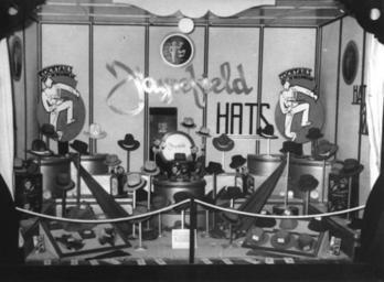 | Keywords: StateLibQld 1 130743 Display of men's hats, Brisbane, ca. 1937.jpg en Display of men's hats Brisbane ca 1937 A variety of men's hats in different shapes sizes and colours made by Fayrefield Hats The exhibit is roped off and may have been part of a display in a department store or possibly for the Brisbane Show circa 1937 handle 10462/deriv/80323 Item is held by John Oxley Library State Library of Queensland PD-Australia StateLibQld-License Men's clothing of Australia Headgear of Australia People with hats Exhibitions in Australia 1937 in Brisbane Black and white photographs |
