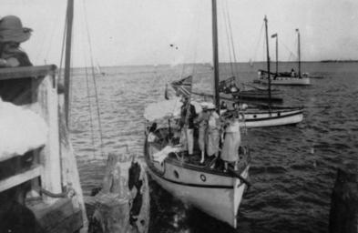 | Keywords: StateLibQld 1 131803 Opening the Sandgate Sailing Club in 1922.jpg en Opening the Sandgate Sailing Club in 1922 Yachts decorated with flags moored off the jetty at Sandgate The front vessel is the Roberta and has a sun canopy on the aft deck and flags flying from the mainstay Three women on the bow are dressed in 1920s fashionable dresses and hats The boat was built by Albert Drew 1922-09-26 handle 10462/deriv/78662 Item is held by John Oxley Library State Library of Queensland PD-Australia StateLibQld-License Wharves and quays in Australia Sandgate Queensland 1922 in Australia Sailing yachts of Australia Women's clothing of Australia Black and white photographs |