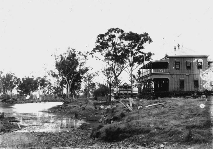 Keywords: StateLibQld 1 138587 Leo Hotel moving along Lime Street, Clermont, 1917.jpg en Leo Hotel moving along Lime Street Clermont 1917 Following the flood that virtually destroyed Clermont in December 1916 the people of Clermont voted to move the town to higher ground 'Each building was raised on jacks and timber rails laid underneath it and for about one hundred metres ahead A steam traction engine then winched the building slowly along the track When it came to the end of the track the rails were collected and laid down in front for another hundred metres Considering the size of the task of moving a hotel the procedure did not take long The contract to move the Grand Hotel was signed in June 1917 the steam engine began its work on 16 August and by 15 September the Grand was opposite its new site on the corner of Capella and Daintree Streets While the hotel was 'on the road' the boarders had their meals served in the dining room as usual and slept in their rooms each night The other hotels were also moved in this way although the Commercial being so large and built in an 'L' shap plan was sawn in half and moved in two sections Other buildings moved by traction engine included several houses and Griffin's store ' Information taken from G C Pullar A shifting town glass-plate images of Clermont and its people 1986 Town Hall in background and lagoon on the left 1917 handle 10462/deriv/12273 Item is held by John Oxley Library State Library of Queensland Pullar Gordon C PD-Australia StateLibQld-License Floods in Queensland Hotels and pubs in Clermont Queensland Lagoons of Queensland Steets in Clermont 1917 in Queensland Black and white photographs Transport of buildings