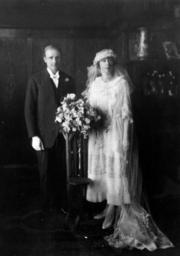 | Keywords: StateLibQld 1 139762 Bride and groom, ca. 1923.jpg en Bride and groom ca 1923 The bride is wearing elbow length lace gloves and has a large bouquet of flowers Her dress has insets of lace and the collar and cuffs have pleated georgette ruffles Her satin shoes are decorated with small floral sprays circa 1923 handle 10462/deriv/11723 Item is held by John Oxley Library State Library of Queensland PD-Australia StateLibQld-License Brides of Australia Wedding dresses in Australia Grooms of Australia Men's clothing of Australia Building interiors in Queensland Flower bouquets in Australia Shoes of Australia Black and white photographs |