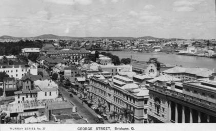 | Keywords: StateLibQld 1 153515 Aerial view of George Street, Brisbane, ca. 1935.jpg supplied with photograph circa 1935 handle 10462/deriv/117803 Copied and digitised from an original postcard Murray series no 27 PD-Australia StateLibQld-License Cityscapes in Queensland Views of Brisbane Brisbane River George Street Brisbane 1935 in Queensland Black and white photographs Images of postcards from the State Library of Queensland Murray View postcard series | ||||