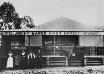 | Keywords: StateLibQld 1 15498 Baree Post Office Store, Mt. Morgan, ca. 1900.jpg en Baree Post Office Store Mt Morgan ca 1900 A group of people are standing outside the store and a gentleman is mounted on a horse The proprietor of the store at the time was J McGladdery circa 1900 handle 10462/deriv/146803 Item is held by John Oxley Library State Library of Queensland Lundager J H Jens Hansen PD-Australia StateLibQld-License General stores in Queensland Post offices in Queensland Children's clothing of Australia Buildings in Mount Morgan 1900 in Australia Women's clothing of Australia Black and white photographs |