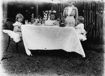 | Keywords: StateLibQld 1 167479 Children's afternoon tea party in a garden, Marlborough, 1900-1910.jpg en Children's afternoon tea party in a garden Marlborough 1900-1910 Children's afternoon tea party in a garden Three young girls sit at a table and a woman stands behind them Two girls sit on cushions The table is spread with a tablecloth cake cordial and flowers Part of a verandah and wooden fence can be seen in the background between 1900 1910 handle 10462/deriv/112154 Item is held by John Oxley Library State Library of Queensland PD-Australia StateLibQld-License Children of Queensland Children's clothing of Australia Groups of people in Australia Gardens in Queensland Tea parties 1900 in Australia Black and white photographs Marlborough Queensland |