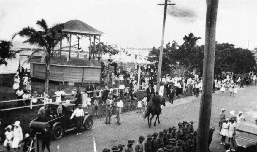 | Keywords: StateLibQld 1 171811 Wynnum Central Beach Bandstand, ca. 1929.jpg  en Wynnum Central Beach Bandstand ca 1929 The street scene in front of the bandstand shows people mingling with a horse and a motor vehicle Soldiers are standing in two lines in the foreground circa 1929 handle 10462/deriv/106847 Item is held by John Oxley Library State Library of Queensland PD-Australia StateLibQld-License Bandstands in Australia Vehicles in Australia Military people of Australia Wynnum Queensland 1929 in Queensland Black and white photographs |