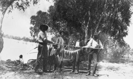 | Keywords: StateLibQld 1 176999 Fishermen with their catch at Boulia, Queensland, 1917.jpg en Fishermen with their catch at Boulia Queensland 1917 Fishing on the Bourke River Caption of back of photograph reads ' Catching a haul for Good Friday 1917 at Boulia' 1917 handle 10462/deriv/100544 Item is held by John Oxley Library State Library of Queensland PD-Australia StateLibQld-License Fishing in Australia Men's clothing of Australia River banks Fish of Australia Boys of Australia Boulia Queensland 1917 in Queensland Black and white photographs Easter 1917 Easter in Australia |