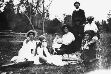 | Keywords: StateLibQld 1 177455 Campbell family picnic at Pine River Crossing, Queensland, ca. 1918.jpg en Campbell family picnic at Pine River Crossing Queensland ca 1918 G B Campbell and family having a picnic at Pine River Crossing Queensland ca 1918 Mr Campbell stands and the family group sits around a blanket with teacups The group is well-dressed A fence and trees can be seen in the distance circa 1918 handle 10462/deriv/102256 Item is held by John Oxley Library State Library of Queensland PD-Australia StateLibQld-License Children of Queensland Families of Australia Picnics in Australia Clothing of Australia Countryside in Australia Black and white photographs |