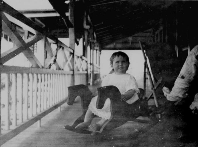 Keywords: StateLibQld 1 179255 Althea Cook at Greenmount, Queensland, 1910-1920.jpg en Althea Cook at Greenmount Queensland 1910-1920 Althea Cook at Greenmount near Balnagowan Queensland 1910-1920 She sits in a child's rocking chair on the verandah The wooden railing and ceiling can be seen A deck chair is on the left An adult grasps a corner of the rocking chair between 1910 1920 handle 10462/deriv/103250 Item is held by John Oxley Library State Library of Queensland PD-Australia StateLibQld-License Children of Queensland Children's clothing of Australia 1910 in Australia Black and white photographs Rocking horses Veranda furnishings Queensland Balnagowan Station |