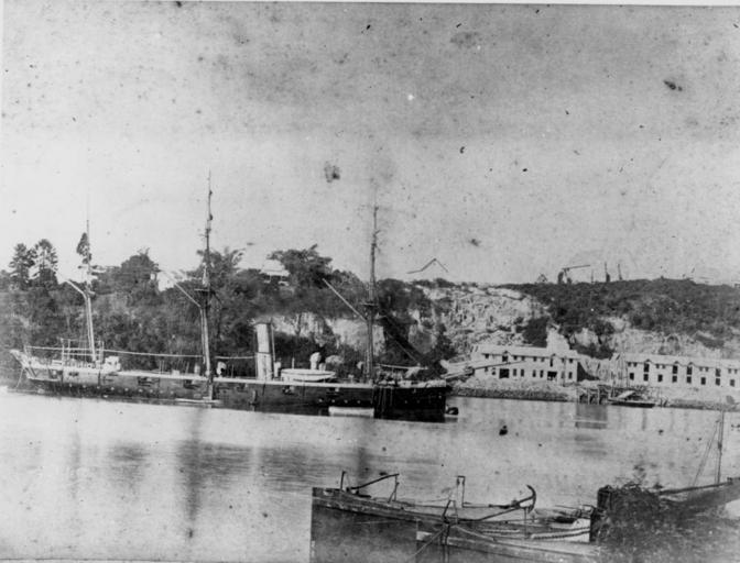 | Keywords: StateLibQld 1 181279 Ship anchored in the Brisbane River, in front of the Naval Stores at Kangaroo Point, Queensland, ca. 1887.jpg en Ship anchored in the Brisbane River in front of the Naval Stores at Kangaroo Point Queensland ca 1887 Large cargo ship anchored in the Brisbane River in front of the Naval Stores at the base of the Kangaroo Point cliffs around 1887 St Mary's Anglican Church is faintly visible above the Naval Stores circa 1887 handle 10462/deriv/124483 Item is held by John Oxley Library State Library of Queensland PD-Australia StateLibQld-License Ships in Queensland Cliffs of Australia Brisbane River Churches in Brisbane Naval bases Black and white photographs |