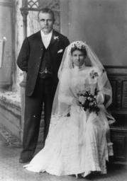 | Keywords: StateLibQld 1 196895 Sgt Major Nickel and his wife.jpg en Sgt Major Nickel and his wife Sgt Major Nickel was manager of the State Agricultural Farm possibly at Toowoomba Mrs Nichel's wedding gown shows a pin-tucked skirt her veil is embroided and trimmed with lace She is carrying a bouquet and has a corsage pinned to her bodice the flowers are repeated in her hair The groom's dark suit is adorned with a corsage and fob chain circa 1890 handle 10462/deriv/95530 Item is held by John Oxley Library State Library of Queensland PD-Australia StateLibQld-License Portraits of Queensland Grooms of Australia Brides of Australia Buttonhole flowers Wedding dresses in Australia Veils in Australia Flower bouquets in Australia Corsage jewellery Bodices Black and white photographs |