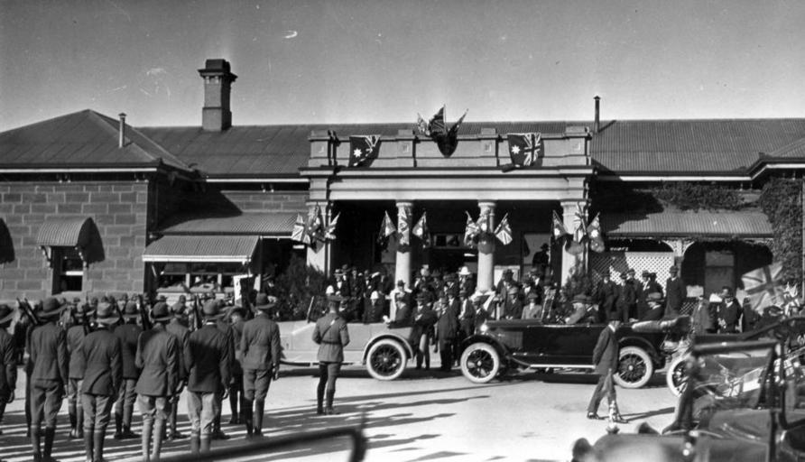 | Keywords: StateLibQld 1 205408 Warwick Railway Station during the visit from His Royal Highness, Edward, Prince of Wales, 1920.jpg en Warwick Railway Station during the visit from His Royal Highness Edward Prince of Wales 1920 Warwick Railway Station during the visit of the His Royal Highness Edward Prince of Wales on 26 July 1920 Prince Edward visited Warwick for about an hour on Monday 26 July 1920 He arrived at Warwick by train at 3pm and was greeted by the Mayor Alderman R E Gillam A band played the National Anthem and the Prince was escorted through the main entrance of the railway station to where returned soldiers were drawn up in files He passed here and there through the ranks shook hands with one or two of the men and chatted for an instant before passing onto another He then stepped into the waiting car and was driven down Grafton Street to the cheering of the people The car took him to the Rotunda in Leslie Park where the Prince received a gift of painted views of Warwick The Prince was then driven back to the railway station The train moved off to the accompaniment of ringing cheers with the Prince standing on the platform at the rear of the rail car Information taken from The Warwick Daily News 27 July 1920 p 5 1920-07-26 handle 10462/deriv/127275 Item is held by John Oxley Library State Library of Queensland Contributor s King Arnold PD-Australia StateLibQld-License 1920 royal tour of Australia by Edward Prince of Wales Automobiles of Australia Military people of Australia Photographs of flags of England Warwick railway station Queensland Black and white photographs |