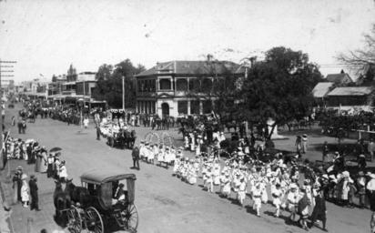 | Keywords: StateLibQld 1 213120 St. George's Day Procession, Warwick, ca. 1913.jpg en St George's Day Procession Warwick ca 1913 Palmerin Street Warwick looking north Inscription on back of postcard reads To Dear Kate I hope you are all well I am sorry to keep you waiting as I was waiting for Mother to get the cards This is only a part of the Procession on St George's Day I hope Grandma Grandfather are well Give my love to all at home This is all the news this time Fondest love from Aileen circa 1913 handle 10462/deriv/137366 Item is held by John Oxley Library State Library of Queensland Contributor s M H Poulsen PD-Australia StateLibQld-License Horse-drawn vehicles in Australia Streets in Warwick Queensland Black and white photographs Saint George's Day Images of postcards from the State Library of Queensland Parades in Queensland 1913 in Queensland |