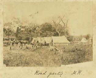 | Keywords: StateLibQld 1 235422 Travelling road party at their camp site, Herbert River, near Ingham, ca. 1881.jpg en Travelling road party at their camp site Herbert River near Ingham ca 1881 circa 1881 handle 10462/deriv/39382 Item is held by John Oxley Library State Library of Queensland PD-Australia StateLibQld-License Campsites in Australia Tents in Australia Horses of Queensland Horse-drawn vehicles in Australia Men of Australia Men's clothing Ingham Queensland Black and white photographs | ||||