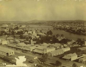 | Keywords: StateLibQld 1 235491 Roma Street between the railway yards and the Brisbane River, 1897.jpg en Roma Street between the railway yards and the Brisbane River 1897 Taken from the chimney of the new power house at the Countess Street tram depot Photograph features a view of the Brisbane River and the Victoria Bridge The suburb of South Brisbane is to the centre right of the photograph See also image numbers APO-023-0001-0001; APO-023-0001-0002; APO-023-0001-0004; APO-023-0001-0005 1897 handle 10462/deriv/39568 Item is held by John Oxley Library State Library of Queensland PD-Australia StateLibQld-License Cityscapes in Queensland Second Victoria Bridge Brisbane Shops in Queensland Brisbane River Roma Street Brisbane 1897 in Brisbane Black and white photographs |