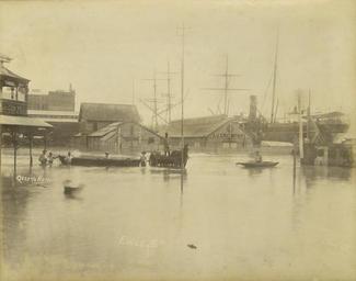 | Keywords: StateLibQld 1 252520 Floodwaters at Eagle Street wharves, Brisbane, 1890.jpg en Floodwaters at Eagle Street wharves Brisbane 1890 Small boats are floating on floodwaters where the road should be A horse pulling a cart is standing in water almost up to his belly and men are standing waist deep at the boat Sailing ships are moored at the wharves riding high on the water 1890-03-01 handle 10462/deriv/120283 Item is held by John Oxley Library State Library of Queensland Hogg John Jackson PD-Australia StateLibQld-License 1890 Brisbane flood Eagle Street Brisbane 19th-century photographs of Queensland Black and white photographs Ships in Brisbane |