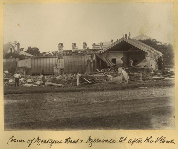| Keywords: StateLibQld 1 256172 House devastated by floods in South Brisbane, 1893.jpg  en House devastated by floods in South Brisbane 1893 February 4 1893 saw the highest floods on record in Brisbane and elsewhere; 6ft water in Edward Street at the Courier Buildings hundreds of houses washed down river trees uprooted and shipping torn from moorings The Indooroopilly Bridge was washed away and the northern end of Victoria Bridge disappeared Floodwaters rose at Brisbane to 23 feet 9 inches above mean spring tide and 10 feet over the previous highest flood mark 1890 A second flood almost reaching the level of the first was experienced on the 19th a lesser one having prevailed on the 13th South Brisbane was without fresh water for some days and the whole of Brisbane was practically in darkness at night A very large relief fund 70 000 pounds was established subscriptions in money and in kind arriving from England as well as from the other colonies Information taken from Queensland State Archives database 2004 - 2006 retrieved 11 January 2006 from <http //www archives qld gov au/exhibitions/virtualexhibition/images/1893introduction asp> House is on the corner of Merrivale Street and Montague Road South Brisbane 1893 handle 10462/deriv/122537 Item is held by John Oxley Library State Library of Queensland PD-Australia StateLibQld-License Houses in South Brisbane Queensland 1893 Brisbane flood Black and white photographs Floods in South Brisbane |