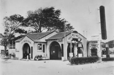 | Keywords: StateLibQld 1 290915 City Service Station, Mackay, 1939.jpg en City Service Station Mackay 1939 Spanish style building with feature arches and tiled roof Several petrol pumps are lined up outside the building Various advertising signs for branded petrol including Plume Castol and Texaco are placed on the building City Service Sation is written above one of the arches A collection of oil bottles have been placed under a poster between two of the arches A very large neon petrol sign is at the front of the building facing the road 1939 handle 10462/deriv/149646 Item is held by John Oxley Library State Library of Queensland PD-Australia StateLibQld-License Advertising signs in Queensland Buildings in Mackay 1939 in Australia Black and white photographs Petrol stations in Queensland |