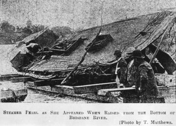 | Keywords: StateLibQld 1 44327 Pearl (ship).jpg en Pearl ship Following the wreck of the 'Pearl' on 13 February 1896 the hulk was discovered on 19 February off Hancock Brothers Wharf South Brisbane It was raised onto Peter's slip on Friday 6 March 'The wreck presents a deplorable appearance The starboard side of the hull is quite sound but the port bulwarks have been terribly smashed up The deck has been swept clean with the exception of the cabin forward The boiler is out of the vessel but the greater part of the machinery is still there The main deck where the bridge stood is all broken up and the top deck together with the awnings has vanished completely A few bent and twisted iron stanchions remain on the cabin deck forward but the bow is badly smashed about The hull was full of mud' Information taken from The Queenslander 14 March 1896 1896-03-06 handle 10462/deriv/145738 Copied and digitised from an image appearing in the The Queenslander 14 March 1896 p 504 Mathews T ; Contributor s The Queenslander PD-Australia StateLibQld-License Ships of Australia Pearl ship Ships in Queensland Brisbane River 1896 in Queensland Black and white photographs |