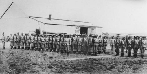 | Keywords: StateLibQld 1 47260 Townsville foot infantry in Hughenden during the Shearers' Strike, 1891.jpg en Townsville foot infantry in Hughenden during the Shearers' Strike 1891 <br /> In early 1891 central Queensland shearers went on strike From February through until May central Queensland was on the brink of civil war Striking shearers formed armed camps outside of towns The culmination of the strike came at Barcaldine when the colonial administration ordered the arrest of the shearers' leaders on charges of sedition and conspiracy Sights such as these large movements of soldiers and their supplies were common throughout the Central Queensland district during this period 1891 handle 10462/deriv/55049 Item is held by John Oxley Library State Library of Queensland PD-Australia StateLibQld-License Military uniforms of Australia Rifles of Australia Farm buildings in Australia 1891 Australian shearers' strike Manual workers of Australia Trade unionism of Australia Farmers from Australia Black and white photographs |
