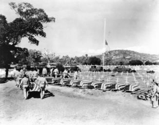 | Keywords: StateLibQld 1 47304 Military cemetery in Townsville, 1943.jpg en Military cemetery in Townsville 1943 <br /> American military funeral at Townsville in 1943 after an American plane crashed in the district with the loss of all on board 1943 handle 10462/deriv/55187 Item is held by John Oxley Library State Library of Queensland PD-Australia StateLibQld-License Military people of Australia Photographs of flags of Australia Flagpoles in Australia Coffins Graves in Queensland Military uniforms of Australia Multiculturalism in Australia World War II home front in Townsville 1943 in Queensland Black and white photographs |