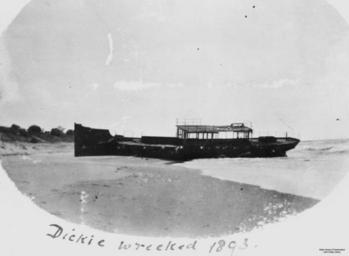 | Keywords: StateLibQld 1 47944 Dicky (ship).jpg en Wreck of the ship Dicky on the beach at Caloundra Queensland She was wrecked in 1893 and this photo may have been taken about 1900 “1910 handle 10462/deriv/55697 Item is held by John Oxley Library State Library of Queensland PD-Australia StateLibQld-License DEFAULTSORT Dicky Black and white photographs of Queensland Black and white photographs of ships Dicky ship 1883 1910 Ships in Queensland | ||||