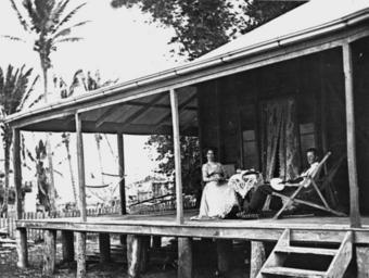 | Keywords: StateLibQld 1 66031 Man and woman relaxing on the verandah of their farmhouse, 1911.jpg en Man and woman relaxing on the verandah of their farmhouse 1911 A man and woman relax on deck chairs on the verandah of their home in 1911 A hammock hangs in the corner of the verandah and palm trees blow in the breeze in the background The man holds a small hand fan and tea is being served on an elaborate lace tablecloth 1911-06-01 handle 10462/deriv/77150 Item is held by John Oxley Library State Library of Queensland PD-Australia StateLibQld-License Verandas on single story Queensland houses Deckchairs in Australia Arecaceae in Australia Hammocks Sheep and cattle stations in Queensland 1911 in Australia Black and white photographs Tea on the veranda Queensland |