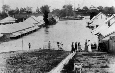 | Keywords: StateLibQld 1 85624 Floods in Ferry Street, Kangaroo Point, Brisbane, Queensland, 1893.jpg en Floods in Ferry Street Kangaroo Point Brisbane Queensland 1893 <br /> Brisbane River in the 1893 flood at Ferry Street Kangaroo Point looking north to New Farm Brisbane Flood waters have submerged houses to a few feet below the roof line People have gathered to overlook the flood waters and a large sailing boat is anchored in the Brisbane River 1893 handle 10462/deriv/62722 Item is held by John Oxley Library State Library of Queensland PD-Australia StateLibQld-License Streets in Kangaroo Point Sailing ships in Queensland 1893 Brisbane flood Brisbane River Black and white photographs 19th-century photographs of Queensland |
