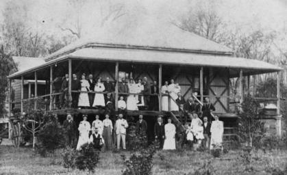 | Keywords: StateLibQld 1 86644 Family members at a wedding, possibly at the Traves home, Kilcoy district, ca. 1901.jpg supplied with photograph A very large group of people are gathered outside the home Many are on the veranda including the bride and groom some are on the steps and more are in the garden Everyone is in formal dress circa 1901 handle 10462/deriv/63320 Item is held by John Oxley Library State Library of Queensland PD-Australia StateLibQld-License Families of Australia Wedding ceremonies in Australia Women's clothing of Australia Men's clothing of Australia Colonial architecture in Australia Houses in Kilcoy Black and white photographs |