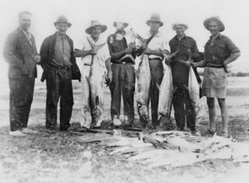 | Keywords: StateLibQld 1 88396 Fishing party displaying their large catch of Spanish Mackerel, Bowen, ca. 1928.jpg supplied with photograph circa 1928 handle 10462/deriv/64158 Item is held by John Oxley Library State Library of Queensland PD-Australia StateLibQld-License Fishing in Australia Fish of Australia Unidentified Scomberomorus Groups of people in Australia Bowen Queensland Black and white photographs | ||||
