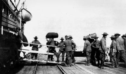 | Keywords: StateLibQld 1 90212 First troops to leave Brisbane, 1914, boarding the Omrah (ship).jpg en First troops to leave Brisbane 1914 boarding the Omrah ship Some soldiers are standing on the dock and others are carrying their army bags up the gangway The side of the ship and lifeboat are visible 1914 handle 10462/deriv/65925 Item is held by John Oxley Library State Library of Queensland PD-Australia StateLibQld-License Military people of Australia Ships of Australia Wharves and quays in Australia World War I home front in Brisbane Omrah ship 1899 Ships in Queensland 1914 in Queensland Black and white photographs Boarding in water transport |