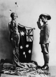 | Keywords: StateLibQld 1 93636 Young man and woman from a dramatic society striking a pose, Brisbane, 1930-1940.jpg en Young man and woman from a dramatic society striking a pose Brisbane 1930-1940 Young man dressed as a soldier saluting a young woman wearing the Australian flag with a headpiece possibly designed to represent the Southern Cross between 1930 1940 handle 10462/deriv/72250 Item is held by John Oxley Library State Library of Queensland Deazeley T E PD-Australia StateLibQld-License Military uniforms of Australia Formal clothing in Australia Photographs of flags of Australia Brisbane in the 1930s Black and white photographs Flags as clothing |