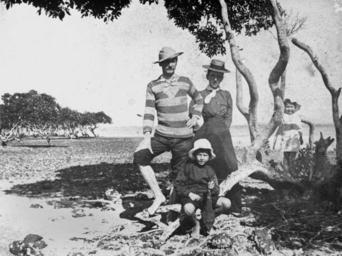 | Keywords: StateLibQld 1 99168 Family outing at King Island, 1890-1900.jpg en Family outing at King Island 1890-1900 Portrait of family at King Island possibly on holiday The man wears a striped top and his trousers are rolled up to the knee The woman wears a scarf blouse and skirt A young child stand to the right and a boy sits at the front and holds a fish The group poses under a tree between 1890 1900 handle 10462/deriv/67198 Item is held by John Oxley Library State Library of Queensland PD-Australia StateLibQld-License Children of Queensland Families of Australia Groups of people in Australia Clothing of Australia 1890s in Australian society Islands of Queensland Queensland in the 1890s Black and white photographs |